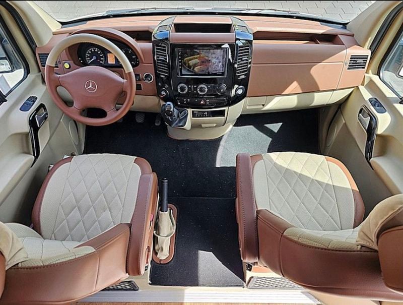 All’interno, la conversione tende verso una specifica di tour di lusso, con una disposizione pensata che equilibra comfort, spazio e versatilità. Tra i punti salienti ci sono sedili capitano in pelle color pergamena, una cabina ben attrezzata con Apple CarPlay e telecamera a retromarcia, e un salotto executive posteriore con quattro sedili in pelle a cinture, riscaldamento e prese di ricarica. Lo spazio abitativo presenta un altro sedile passeggero, un bagno-wetroom, una cucina integrata, un letto a scomparsa con illuminazione ambient, pannelli solari, riscaldamento a diesel e allacciamento alla rete elettrica, rendendolo adatto a viaggi prolungati off-grid.