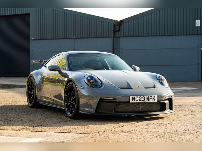 This GT3 was specified with black exterior paintwork over a black leather and Alcantara-trimmed interior with grey contrast stitching, black seatbelts, and an Alcantara-clad steering wheel.