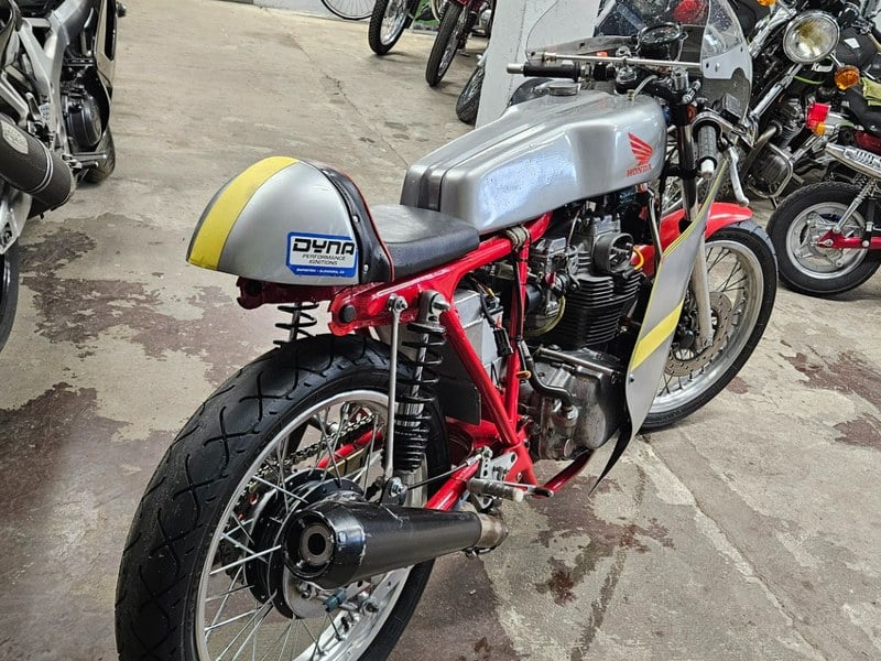 Restored summer 2024, this immaculate 1973 CB350G has been fully customised. The original bike had 6000 miles and was in great condition. The frame has been professionally modified to include a seat loop and is freshly powder coated in satin black. The forks have been serviced and rebuilt with new stanchions and the rear suspension is brand new. The wheels have been rebuilt with new spokes on new lighter aluminium rims with the original hubs powder coated. The wiring loom is completely custom and terminates to a Purpose Built Moto Black Box in a custom low profile battery tray creating the clean look. A combined solid state regulator rectifier has also been installed. Switch gear and indicators are provided by Purpose Built Moto along with the exhaust headers and the cockpit look is completed by a new minimal speedometer. All lights are LED allowing for a smaller battery and clean look. The seat is custom made and trimmed in brown leather by Calulfield Leather and is very comfortable. The fuel tank has been refurbished and painted in classic Porsche granite green metallic. The engine has been rebuilt with all new hex bolts replacing the JIS screws, all new gaskets and given a fresh coat of silver paint.