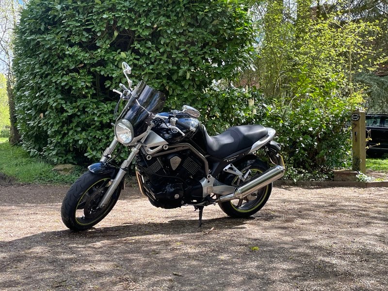 Has a cracked tail plastic. A super rare Yamaha Bulldog BT1100. Tons of torque, cruiser engine out of a VStar, Italian frame, XJR forks, R1 brakes. Strange combination that works, great for cruising but can hold its own in the corners.