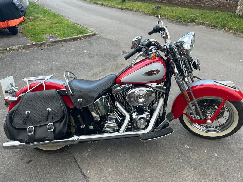 Good condition Heritage Softail Springer FLSTSl 1450. This is the fuel injected version. A few paint chips and some rust spots on the chrome wheels, gearbox cover and frame but overall pretty good. Extras include Genuine H-D windshield plus bag and two QD Genuine H-D racks/ sissy bar as well as the OEM leather panniers. Thousands recently spent on proper H-D Screamin’ Eagle upgraded cam chain tensioners; a modification that is vital on all the 1450 Twin Cam models. If this isn’t done the engine can be badly damaged when the OEM tensioners disintegrate. By all means Google the well-documented problem. This one is now fully future-proofed and can be enjoyed without concerns about its durability. This is a two-owner bike, a personal import to UK from the US, the first American owner cherished it over twenty years. Used sparingly and serviced annually but with little actual documented service history. I carried out the last annual service for the previous owner in 2024. Recent work by a very well-respected marque expert includes Screamin’ Eagle hydraulic cam chain tensioners and new camshaft plate with upgraded high pressure oil pump and bearings and S&S Speedy Adjustable Push Rods fitted. The crank run-out was measured at the time and was well within tolerance so this is a great engine with much reliable service left in it. A full annual service was also carried out. This included all engine fluids and the brake fluids being changed and drive belt correctly tensioned, so it is ready to tour now.