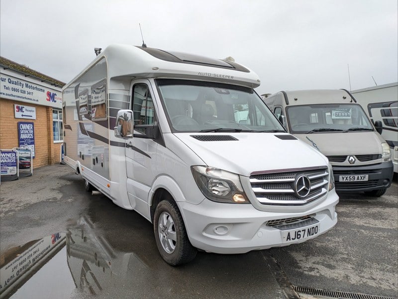 Auto-Sleeper Burford. 4 lugares para dormir, 2 cintos de segurança. Licença C1 obrigatória. Compatível com ULEZ. Situado na parte dianteira, a sala de estar pode acomodar 6 pessoas com os bancos da cabina virados para dentro, e transforma-se numa cama de casal. Numa sala separadora, a cama de casal à francesa encontra-se na traseira. A cozinha vem equipada com forno, grelha, frigorífico de 3 vias, placa, exaustor, lava-louças e micro-ondas. A casa de banho vem de série com sanita tipo cassette, lavatório e duche separado. Disponível no Southern Motorhome Centre agora.
