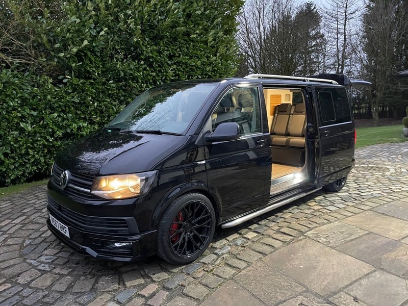 For sale is a stunning all Black VW T6. 1 Campervan with Sportline styling, lowered and re-mapped. It has been professionally converted by Maverick Conversions to an extremely functional high spec with a full Off-Grid Victron electrical system and Stide full length rail slidding rock and roll bed system. LWB model with tailgate in Deep Black Pearl Metallic, with recent service, replacement cambelt, clutch, dual mass flywheel, rear brake pads and bearings.