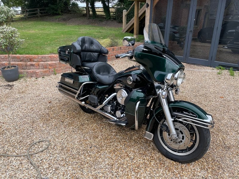 Den mörkgröna/ svarta färgkombinationen är en utmärkt färgkombination, särskilt med pinstripen. 1997 är enligt många ett av de bästa åren för Ultra. Grymt ramverk och sista evo-motorerna. Har också den större topboxen som Harley senare valde att krympa…den här rymmer två vuxna hjälmar…väldigt praktiskt. Kromet är som nytt, lacken som ny (ett par små defekter men väldigt få, ärligt talat). Ny olja och filter, och primärvätska. Nytt bakdäck förra året. Förmodligen en av de snyggaste evo-ultrorna i landet. Precis passerat 19 000 mil (19 003 mil). Helt pålitlig, startar vid varje starttillfälle. Har varit till Skottland och Frankrike med den. Batteriet hålls på en konditionerare när den inte används. Allt fungerar, farthållare, radio osv. Antennerna jag har, men inte på motorcykeln och därmed inte i bilderna. Det finns ett litet rivsår i sätet, jag har inte haft tid att få det fixat.