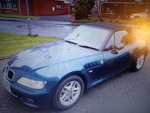 1997 BMW Z3 roadster 1. 9 litre 4 cylinder petrol engine, with FBMWSH, with Boston Green Metallic paint with contrasting red electric leather seats, convertible roof manually , alloy wheels, spare wheel space under the boot , two car covers, in excellent condition for the age of the car , has a current insurance claim for a replacement key due to the age of the classic car, classic car insurance easily sought for less than five hundred pounds, any questions can be addressed accordingly, caveat emptor, in a detached double garage with timber framed sheeting in a middle class private residential area. Viewing by appointment only. Would require collection by yourself as unfortunately no more time can be misspent on this great investment of BMW engineering with numerous car accessories ordered in the garage. Exhilarating drive once back on another MOT and enjoy open top driving for the summer months ahead. One bought this car because of its distinctive colour and the unique opportunity to drive in a car once used in an iconic film associated with Pinewood Studios, England.