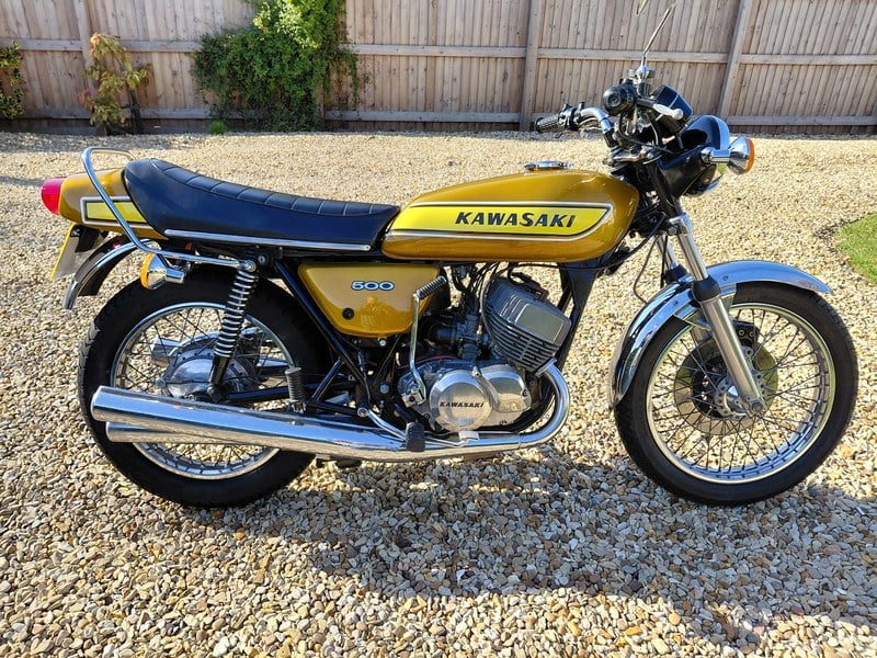 1976 KH500. Ich habe das Motorrad im März 2010 gekauft und es wurde in diesen Jahren nur sporadisch genutzt. Es handelt sich um ein britisches Bike, erstmals im Mai 1976 zugelassen, geliefert vom Pegasus Kawasaki Centre, und es führt die korrekten Rahmen- und Motornummern. Kürzlich von einem sehr erfahrenen Dreizylinder-Spezialisten wieder in Betrieb genommen und läuft sehr gut. Eine neue Rex CDI-Zündungseinheit wurde installiert, außerdem Pickup-Sensor, überholter Kraftstoffhahn, rechte Schaltergruppe, neue Batterie, Zündkerzen. Es trägt derzeit eine nicht-originale Lackierung, da am Tank Arbeiten nötig waren (jetzt behoben, aber ich habe sie noch nicht ersetzt). Insgesamt befindet es sich im recht guten Zustand; gerne sende ich detailliertere Infos, Fotos, Videos usw.