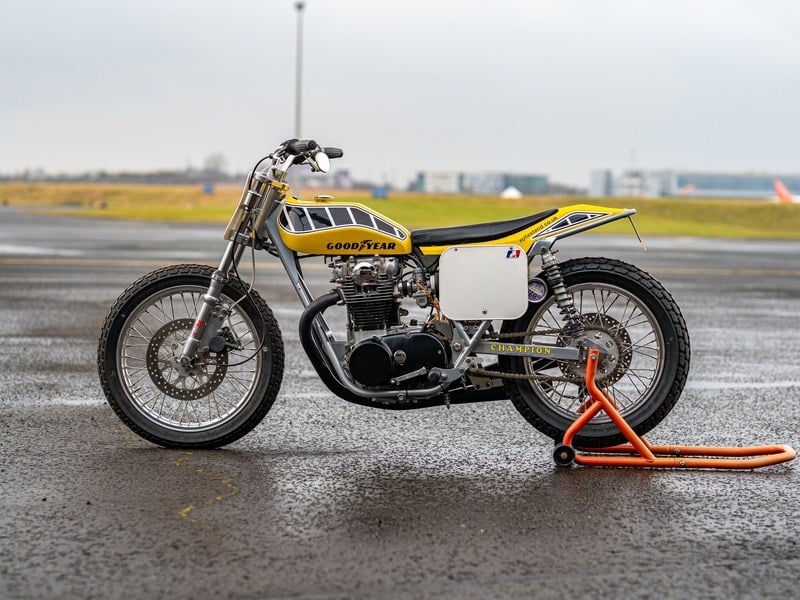 “Champion frame kits were produced in Hayward, California, from 1968 to 1976 by Doug Schwerma. A machine of this type was famously ridden by Kenny Roberts Sr. during his 1973 and 1974 US Grand National title wins. This particular bike has been meticulously prepared to resemble and pay tribute to the legendary Yamaha TZ750 flat tracker that Roberts rode to victory at the 1975 Indy Mile—a race so spectacular that the bike was subsequently banned for being too fast. Finished in Roberts’ iconic colors, it retains authenticity with many components sourced directly from California. This is one of only two known Champion Yamaha 750 flat trackers in the UK, making it a rare and fitting homage to one of flat track racing’s most unforgettable moments.”
