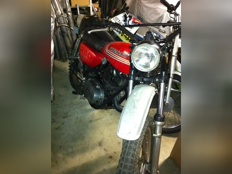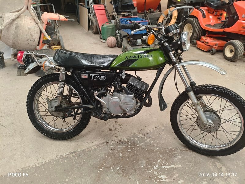 Klassische Kawasaki F7 175cc, Modelljahr 1974 mit Nova-Unterlagen, fahrbereites Bike zum Restaurieren oder auch so zu verwenden, mit guter Prüfung, alles original bis auf den fehlenden Luftboxdeckel, solider Sitzbank, Tank fest und von innen sauber, solider Auspuff mit Schalldämpfer, Beleuchtung etc. funktionieren, Reifen sehen original aus, daher vor der Nutzung prüfen, aber insgesamt ein hübsch aussehendes klassisches Trail-Bike.