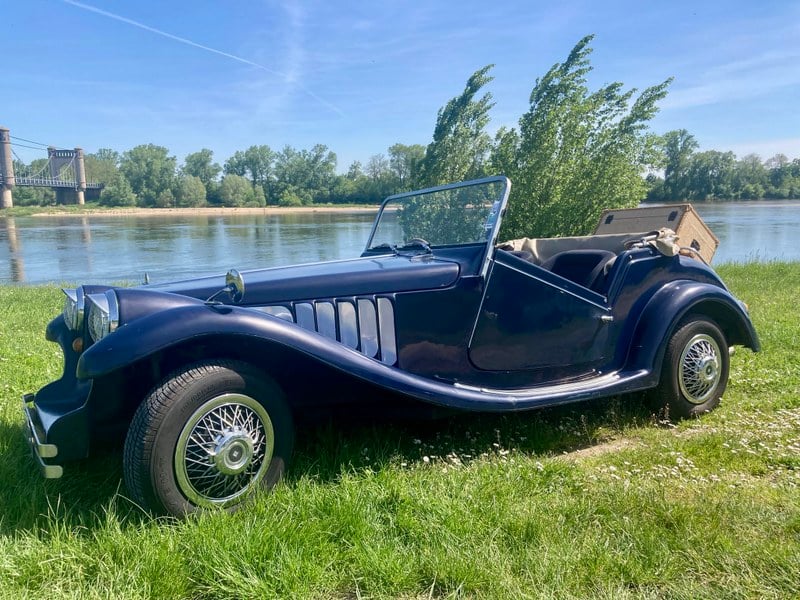I’m selling a superb 1977 English Pilgrim Bulldog roadster. Dark blue colour, chrome, wire wheels. It resembles a MG TD or a Morgane. Interior and beige faux-leather soft-top fully refurbished. French collection registration (FFVE certificate).