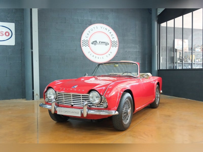 Capots Vintage, specialist in sports and classic vehicles in Lyon, offers for sale a 1962 Triumph TR4: The Triumph TR4 we are offering today was delivered new in 1962, and is presented in a very elegant red configuration, sublimated by black upholstery with classic bucket seats, in perfect harmony with the model's sporty and timeless character.