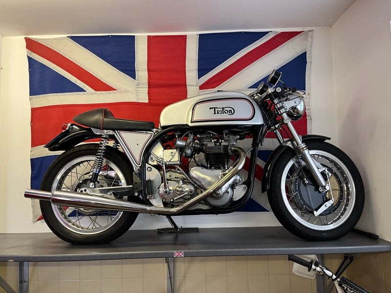 Triton 1954 Widline frame 650cc Triumph engine pre unit engine nine stud head twin carbs Rear Crome bolt up frame fantastic front brake. Alloy petrol and oil tanks. F0UR SPEED GEARBOX. Part of my private collection for nine years. Been kept in a heated garage all that time.