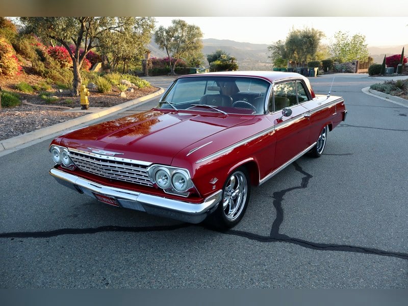 1962 Chevrolet Impala SS. This Impala comes with a 350 V8 engine and an automatic four speed transmission. Equipped with power steering, power brakes and air conditioning. Has four wheel Wilwood disc brakes. Drilled and slotted rotors. Air conditioning blows cold. This vehicle runs and drives. Rev aftermarket five spoke wheels. Under the hood it has a Edelbrock carburetor, aluminum intake manifold, chrome valve covers, chrome air cleaner, custom hood hinges, headers and much more. Red exterior with a Tan interior.