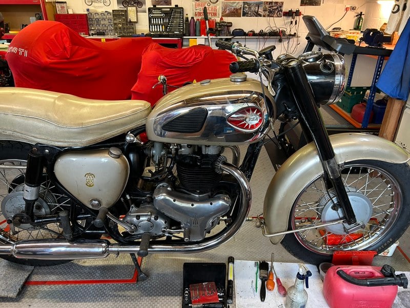 BSA Golden Flash 1961. Alle Originallackierungen, originale Decals, sogar der originale Sitzbezug. Großteil des Chroms in Ordnung. Etwas Oberflächenrost an der vorderen Felge.