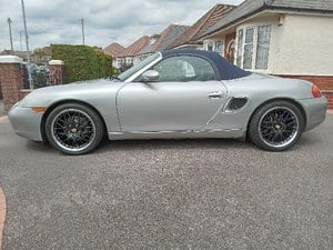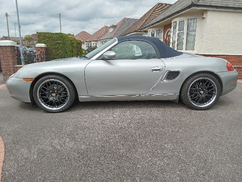 This is a lovely example of the “Future Classic” Porsche Boxster 986. First registered in Sept. 2002 / 52 Plate which means it has the original styling. Finished in Arctic Silver Metallic with Blue Fabric, Electric Folding Roof and Deep Blue Leather Upholstery. The Factory fitted features include : 2700cc Petrol Engine delivering 228 BHP, 5 Speed Tiptronic Sports Automatic Gearbox, Power Steering, Leather Steering Wheel with Gearchange Buttons, Adjustable Steering Column, White Instrument Dials, Leather Upholstery, Sports Seats, Heated Seats, Electric Folding Convertible Roof, (new, with glass window) , Electric Windows, Electrically Adjustable Door Mirrors, Remote Central Locking, Alarm/ Immobiliser, ABS, Radio/ CD Player, BOSE Sound, Rear Wind-stop, Fitted Porsche Carpet Mats, Spare Wheel and Tyre, Locking Wheel Bolts with Key and 18″ Porsche BBS Split Rim Alloy Wheels finished in Anthracite with Pirelli ‘N’ Rated Tyres All Round. This Porsche drives well, sounds fantastic and comes with 2 keys plus the original handbook/ instruction pack which contains the impressive, documented service history. Prices are on the rise…for well cared for and maintained, unmolested example such as this.