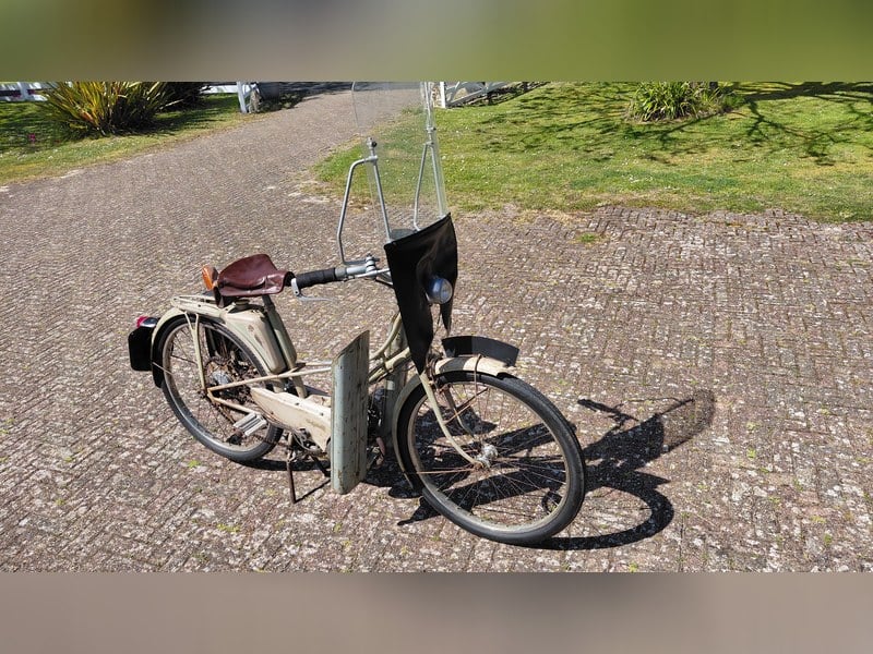 Hora de reduzir a minha coleção de várias motas vintage, uma das quais é esta Motobecane Mobylette AV33 de 1956, que foi encontrada na casa do seu primeiro e único dono até início de 2025. Registada a 6 de junho de 1956 em nome de uma Sra. Harris, em Wiltshire; isto foi confirmado pelo centro de história dos condados, que conseguiu localizar os dados de registo; infelizmente, o antigo livro de registo não sobreviveu. Foi retirada da casa da família depois de os proprietários terem falecido; a última vez que foi tributada para a via pública foi em 1967 e vários selos de imposto da década de 60 acompanham a moto. A DVLA não quis permitir a retenção do número original, mas após ter sido fornecido um certificado de datação/ NOVA, uma inspecção resultou na emissão de um V5 sob a classificação de 'veículo histórico' e com um número relacionado com a data. O mais notável são os acessórios originais que vieram com a máquina, incluindo proteções de perna muito raras e um para-brisas da época sem danos. Esta Mobylette é 100% original, incluindo os pneus Dunlop Autocycle, assento Vidal com bolsa de ferramentas e saco único no lado esquerdo. Está completa e já a conduzi (uma experiência que fica na memória) e posso afirmar com sinceridade que os freios funcionam, mas têm 70 anos e a mota pode ser 'temperamental' ocasionalmente. A corrente de transmissão foi substituída, foi colocado um filtro de combustível inline e agora ostenta a chapa atual. Como já referi, tem 70 anos este ano e quase é uma peça de museu; se tiverem perguntas, por favor perguntem... Sou firme no preço e fico feliz em ajudar com mais fotos ou posso enviar por WhatsApp ou por e-mail um curto vídeo da velha rapariga a funcionar.