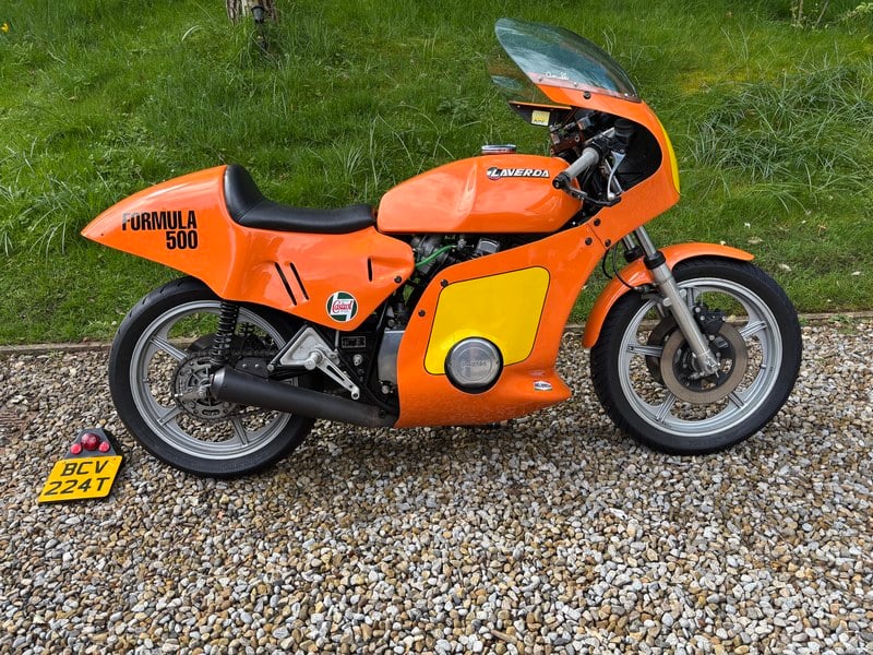 Genuine Series 2 Formula 500 authenticated by Italian paperwork and email from Piero Laverda, therefore 1 of approx. 75 produced for the single make European race series, so rarer than an SFC. Road registered, MOT exempt and zero cost road tax so can be enjoyed on road and track. I have the workshop manual, sales brochures, articles and correspondence from previous owners and have owned this bike for 9 years. Restored with rebuilt engine by Desmo Engineering, powdercoated frame, new shocks and s/ s fasteners, overall excellent condition. Recent Sache ignition and new ignition coils so it now ticks over. Dynod at 46bhp at rear wheel before it was re jetted as it was running a bit rich. I have loved owning and riding this beautiful, rare, angry little rocket, but also pampered it. I have kept a detailed record of track days and maintenance. This is not some dusty old classic that has festered in a shed, but a exotic machine that i have loved riding and refining over the years (so it has the odd chip and craze on the bodywork and wheels, as you would expect). It is in standard condition apart from the coils, ignition, and shocks, but i have kept all the original bits in case someone wants to put it in a museum. Piero pointed out it has the wrong clip on handlebars on it as it has Bimota ones on it, but they are comfy and part of its history before my ownership so I kept them on. Please call for more information or photographs, or better still come and see and hear it.