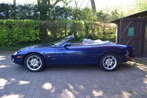 Beautiful sapphire blue Jaguar XK8 convertible with oatmeal leather interior. -> Jaguar XK8 cabriolet bleu saphir magnifique avec intérieur en cuir couleur avoine.
