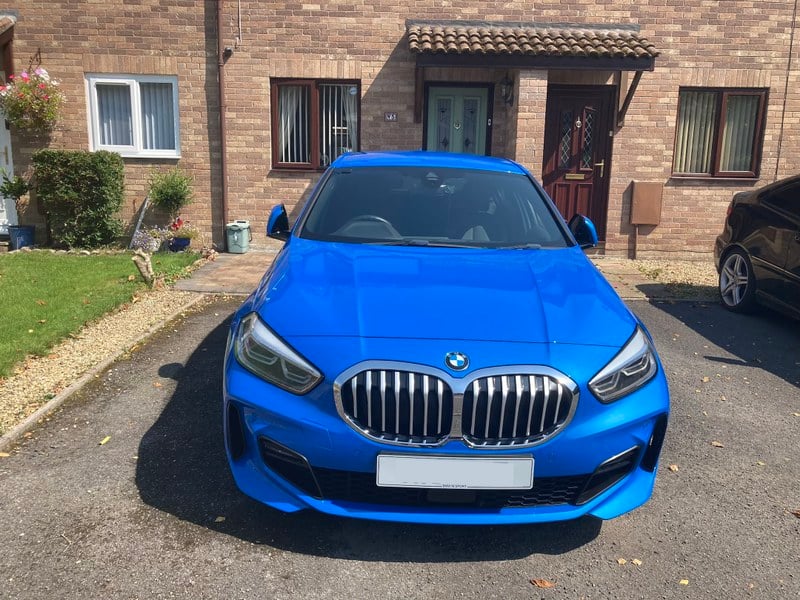 BMW 118i M/ sport em azul metálico Misano, placa 2020/ 70. Tem todas as características habituais: bancos desportivos em couro aquecidos e eléctricos a preto, controlo de climatização, rádio DAB, jantes 18 polegadas em acabamento diamantado, manutenção de concessionário com historial de serviço completo independentemente do custo, 5 meses de MOT sem observações, 24. 451 milhas.