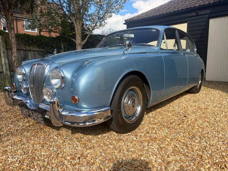 Imagine a late summer afternoon, golden light on the sparkling blue-grey bodywork, leather slightly warmed by the sun, and the muffled purr of the V8 ready to take you on a timeless ride... Key features: Make / Model: Daimler 250 V8 SALOON Year: 1965 Engine: Daimler 2, 548 cm³ V8 Power : Approx. 140 bhp Gearbox: Borg-Warner 3-speed automatic Mileage: 31, 600 km no warranty (5-digit odometer) Body: 4-door saloon Exterior colour: Blue-grey Interior: Blue leather refurbished - varnished woodwork Registration document: Normal Technical inspection: OK less than a year old and will be redone for sale.