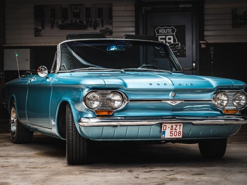 CORVAIR MONZA 900 (967) - First registered on 21 November 1963 (1964 model) – Administrative power: 15 hp – Engine displacement: 2. 687 L – Automatic gearbox – Electric convertible top in very good condition. Its colour at the time of our purchase. Pearl blue paintwork redone in 2019.