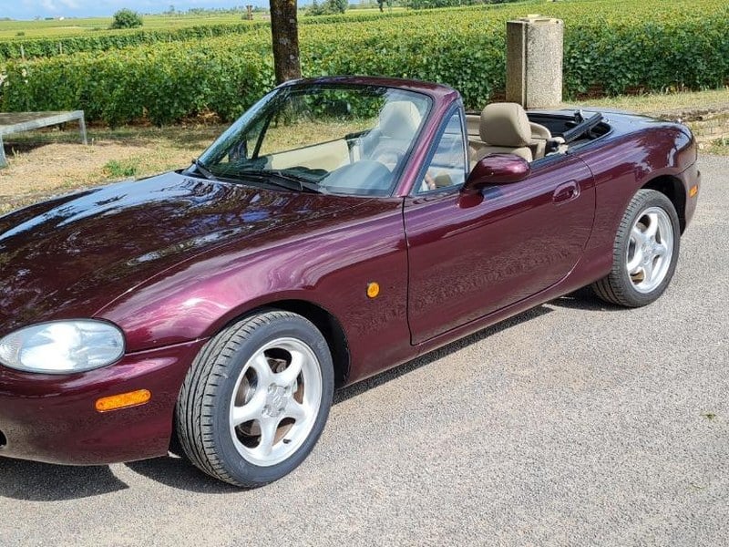 Mazda MX5 NB des Jahres 1999, Cabrio in metallischem englischem Grün mit einer schwarzen Softtop, die sich mit nur einer Hand leicht handhaben lässt. Von dem japanischen Designer Tom Matano entworfen. In perfektem Zustand. Es handelt sich um eine Replika der berühmten Lotus Elan, mit dem kleinen Nardi-Lenkrad. Mit nur 75. 000 km. 4-Zylinder Einspritzmotor, 16 Ventile. Sie haftet dank einer sehr niedrigen Sitzposition und einem perfekt verteilten Gewicht wunderbar auf der Straße.