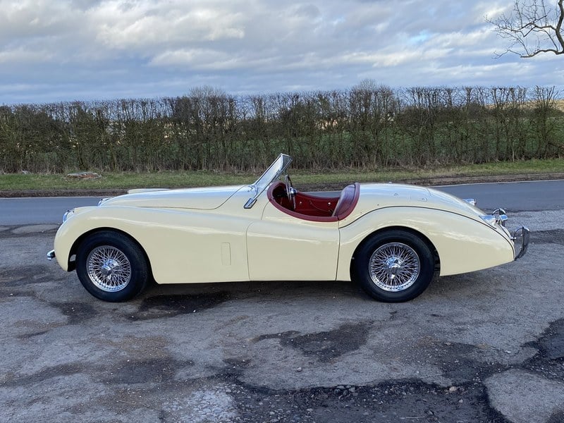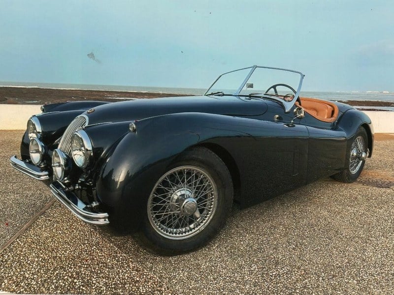 Jaguar XK 120 Roadster OTS 1953 – superb, excellent condition. Full restoration: bodywork, paint, engine, 5-speed transmission, suspension, brakes, electrical loom, lights, chrome, wire wheels and new tyres, leather upholstery, sailscreens and a new hood. Important documentation: restoration photos, Jaguar certificate, invoices and maintenance documents dating back more than 40 years.