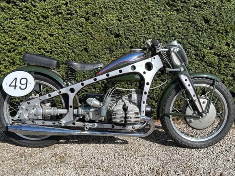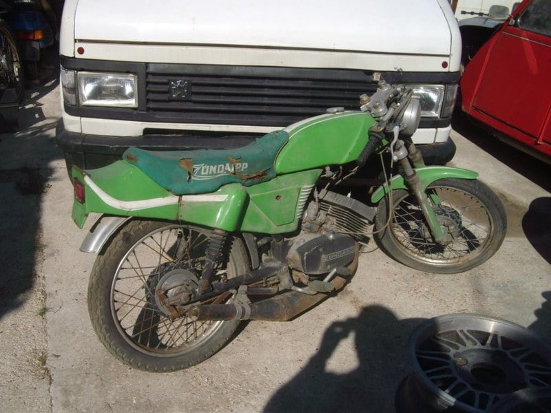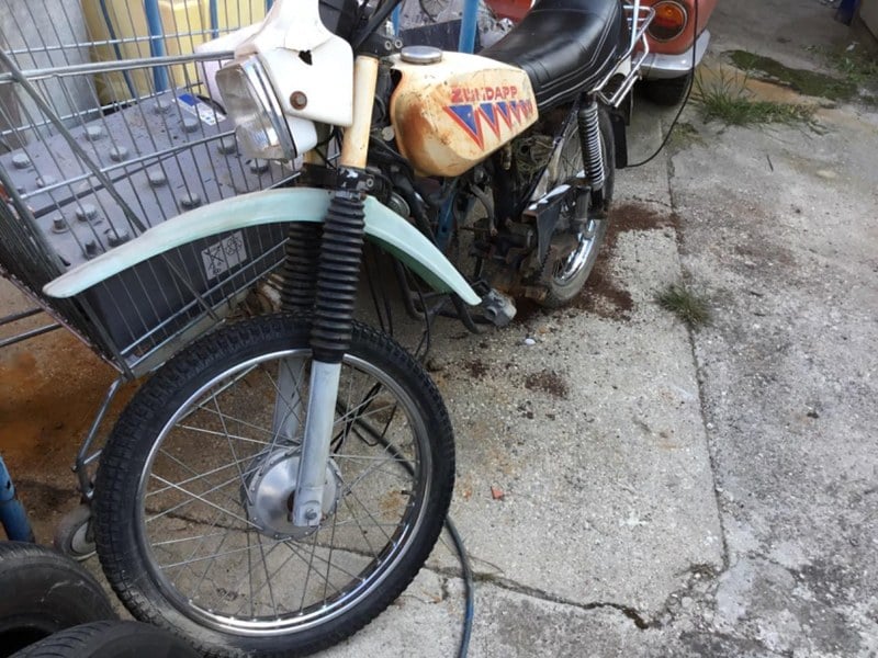 Famel Zundapp apparently XF17, coachbuilt by a sheet‑metal artisan; the sides, toolbox and rear backrest are handmade in sheet metal. It has its fairing with a new windscreen. There’s a 65cc or 70cc kit. To restart, it ran a few years ago.