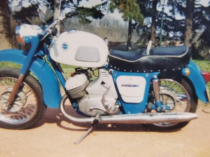 Moto de collection utilisable moteur deux temps bi cylindres fabrication ex URSS sur concept DKW, robuste et originale, trois roues interchangeable dans un état d'origine d'usage, bon fonctionnement.