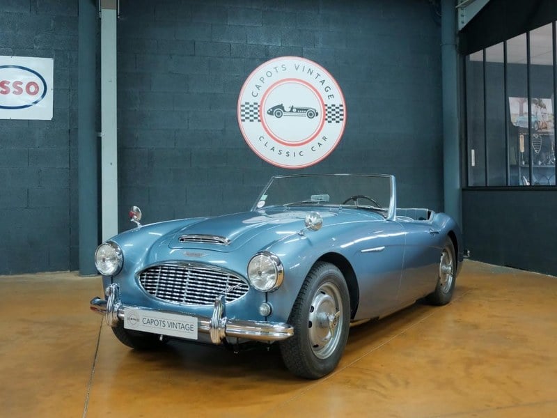 Capots Vintage, specialist in sports and classic vehicles in Lyon, offers for sale an Austin Healey 100-6 BN4 from 1959: Leaving the factory on 23 February 1959 in its Healey Blue colour with navy blue interior, it is an Austin Healey 100/ 6 BN4 that we are offering for sale. A 6-cylinder version of the "Hundred" model with the bodywork of the 3000, the BN4's engine was fitted with a new manifold and a new cylinder head to increase performance and develop 117 horsepower (almost identical to the Austin Healey 3000 BT7). Fully restored some twenty years ago, the bodywork of our car shows a certain patina with a few age-related defects. However, our car is very sound and shows no signs of corrosion. The mechanics and underpinnings (chassis, floorboards and rocker panels) are in excellent condition (see photos). We have the British Motor Heritage certificate to confirm that our roadster is completely Matching Colors and Matching Numbers. The body, engine and gearbox are all original, as is the interior and exterior colour, which was delivered new in 1959. An original detail is that the car is fitted with Dunlop-type wheels, setting it apart from its counterparts equipped with chromed spoke wheels. The car is fitted with a blue PVC soft top with roll bar, tonneau cover and sidescreens. There is no charge for this. It can be traded in for your sports car or collector's car. For more information and photos, visit our website: capotsvintage. com