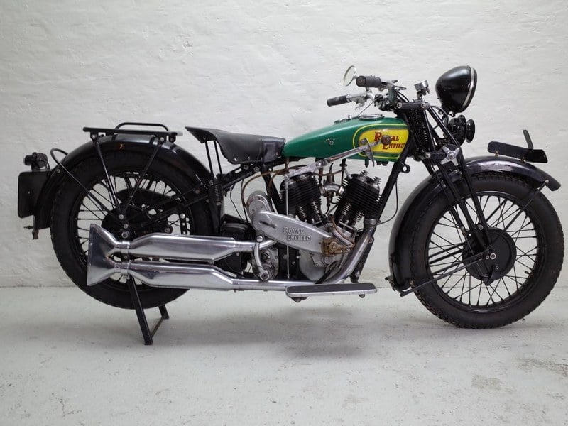 For 1930, the frame was redesigned to lower the saddle height by 3. 8 cm (1½ inches), achieving a more comfortable height of 70 cm (27½ inches). The new front fork incorporated dampers, further improving comfort and handling. Transmission by magneto was provided via a closed aluminium chaincase, with adjustable oil flow, a practical refinement guaranteeing durability. The exhaust system was distinctive, with a single fish-tail outlet for the two silencers. The finish was typically black enamel, the tank painted in two shades of Enfield green, reflecting the brand’s traditional style.