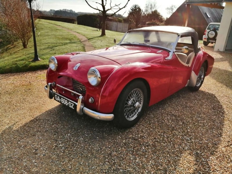 Äkta engelsk TR2, alltså RHD, färg Signalröd, interiör i ljusbeige konstläder, registreringsbevis för samlarbil, kapell och sidoglas i vinyl, skydd för tonneau i läder, värme, kromade ekrade hjul, Véronique, Lita-motorcykelratt, restaurerad för ungefär tjugo år sedan, body off: tandstångsstyrning, Kenlowe-fläkt, generator, frontbromsar med skivor, elektronisk tändning, rostfritt stålavgassystem, osv...