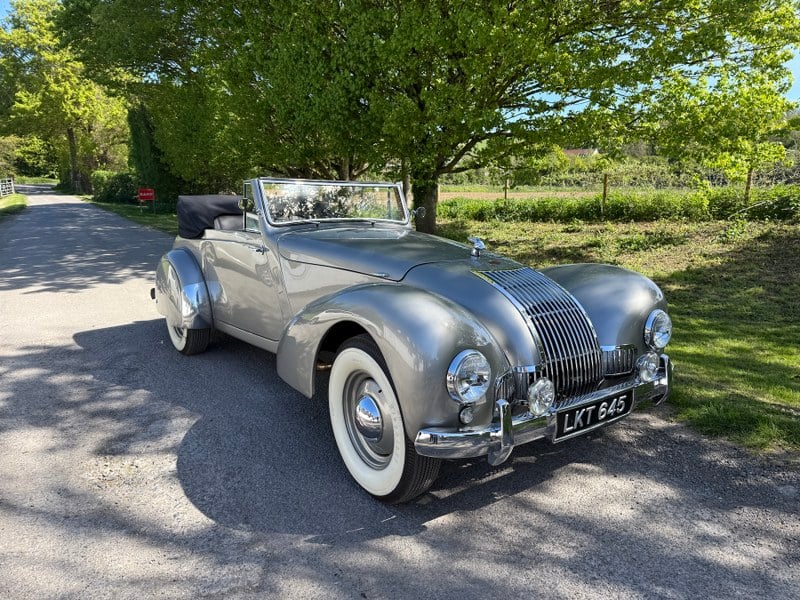 ALLARD K1 von 1948, ausgestattet mit seinem Ford Pilot V8 mit seitlichen Ventilen und dem originalen Hubraum von 3 622 cm³, wurde vor vielen Jahren nach Griechenland importiert, um eine prestigeträchtige Sammlung klassischer Automobile zu bereichern. Es handelt sich um eine der äußerst seltenen überlebenden Allard K1 (man sagt, es gäbe weniger als 20 davon!), stammt aus einer extrem limitierten Produktion von nur 151 Exemplaren, entworfen vom außergewöhnlichen Gründer Sydney Allard zwischen 1946 und 1949. Unsere K1 ist die 143. produzierte K1. Dank ihres leichten Chassis und Karosserie sowie der leistungsstärkeren Ford- oder Mercury-V8 mit seitlicher Ventilführung, die für den europäischen Markt erhältlich waren, bot sie bemerkenswerte Leistungen für ihre Zeit. Ursprünglich für die Straße konzipiert, profitierten die Allard K1 und K2 auch von einem Chassis, das von der berühmten Renn-Allard J2 inspiriert war, was ihnen hervorragendes Potenzial im Wettbewerb verlieh. Die Allard boten ein hohes Leistungs-Gewicht-Verhältnis und gaben frühen US-Modellen wie dem Sunbeam Tiger und der AC Cobra Anfang der 1960er Jahre Vorläufercharakter. Carroll Shelby, der Entwickler der Cobra, und Zora Arkus-Duntov, Chefingenieur der Chevrolet Corvette, fuhren beide Allard zu Beginn der 1950er Jahre, inspiriert von diesen Autos zur jeweiligen Schöpfung der Cobra und der Corvette. Ein sehr erfahrener Mechaniker kümmert sich seit all diesen Jahren in Athen um dieses außergewöhnliche Sportwagen. Sie läuft daher einwandfrei. Ihr Achtzylindermotor erzeugt einen kraftvollen und fesselnden Klang. Dank der akribischen Arbeit unseres leidenschaftlichen Mechanikers wurde die Motorkühlung erfolgreich optimiert. Die vier Felgenzierblenden in ausgezeichnetem Zustand und das Reserverad begleiten das Auto. Unser Auto hat an mehreren Treffen klassischer Autos teilgenommen. Dieser wunderschöne Vintage-Roadster, ausgestattet mit einem großen Motor, von dem sich jeder Sammler in seinem Oldtimer-Modell wünschen würde, ist ein sehr begehrtes Sammlerstück. Sein nächster Besitzer wird von der Schönheit seiner Linien, dem so charakteristischen Klang seines Motors und seinem außergewöhnlichen Fahrverhalten begeistert sein. Laut den Allard-Spezialisten bleiben weniger als 20 Allard K1 übrig! Der Preis ist angesichts seiner großen Seltenheit, seiner Schönheit, seines hervorragenden Zustands und seines enormen Rufs als eine der größten Sportwagen-Nachkriegszeit-Modellen wirklich vernünftig.