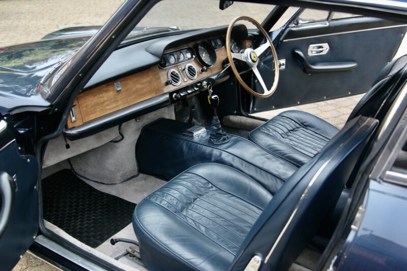 Opening the perfectly formed doors reveals a wonderfully preserved interior with just the right amount of well-earned patina that the 330 wears with pride. The matching Nuvola Blue leather upholstery is free from any real wear, contrasting beautifully against the wooden dash and steering wheel and the whole cabin is typical ’60s Italian refinement, inviting you in with the promise of epic road trips accompanied by sonorous V12 loveliness.