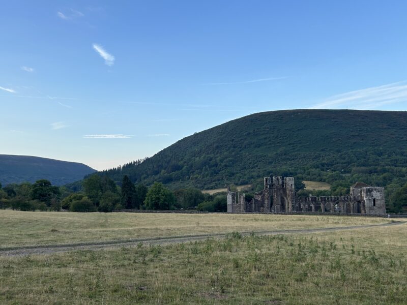 The last ten or so miles were properly remote, devoid of main roads and without a hint of mobile phone signal,. This did leave me wondering how I was going to call the breakdown wagon… Still, the two old commercials soldiered on through the borderlands as the sun dipped behind the mountains. My dim glow of my Lucas lights did their best to illuminate the final few miles towards our destination: the remains of Llanthony Priory – a victim of the Tudor Dissolution.
