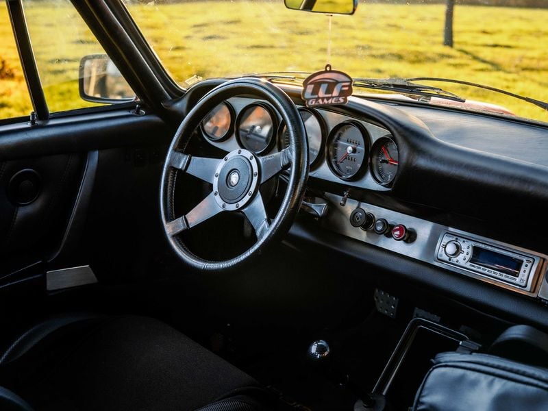 Almost every component on this car has been upgraded following a ground-up rebuild, from the suspension and steering to the brakes and wiring. The three-litre engine’s component parts and connecting cables gleam, while the 959-style wheels are superb. The interior blends period detail, including five traditional dials and lighting pull-switches, with modern additions like Sparco racing seats and a Sony audio system.