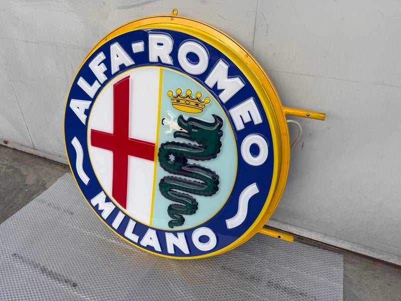 Esta señal de la concesionaria de Alfa Romeo es de doble cara y está iluminada, perfecta para un garaje doméstico o una instalación profesional. Es de buen tamaño y evocadora, ideal para los entusiastas de los motores.