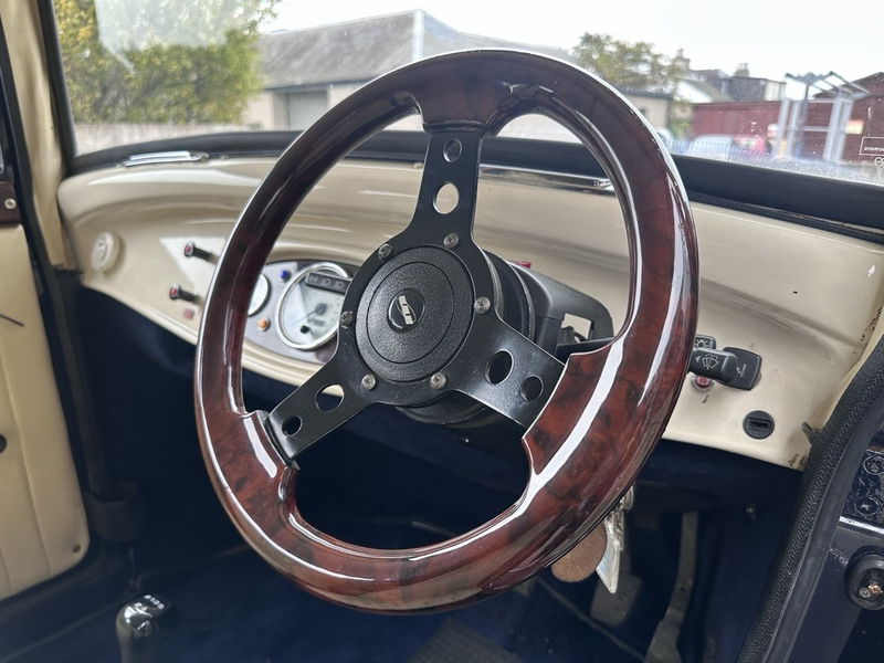 Construit en 1989 selon un design classique de l’entre-deux-guerres, ce VMC Badsworth est un vrai head-turner. Ses origines restent inconnues, mais on suppose qu’il a été construit sur un châssis Ford Sierra contemporain, avec des mécaniques Blue Oval garantissant habituellement une fiabilité robuste. La partie visible de la voiture se compose d’une carrosserie crème et bleu deux tons impressionnante avec une section arrière en toile, une quintette de roues à rayons élégantes et des marchepieds assez larges pour tap-dancer. À l’intérieur, le tableau de bord présente trois cadrans encastrés dans un ovale en bois et une paire d’interrupteurs derrière un imposant volant en bois à trois branches.