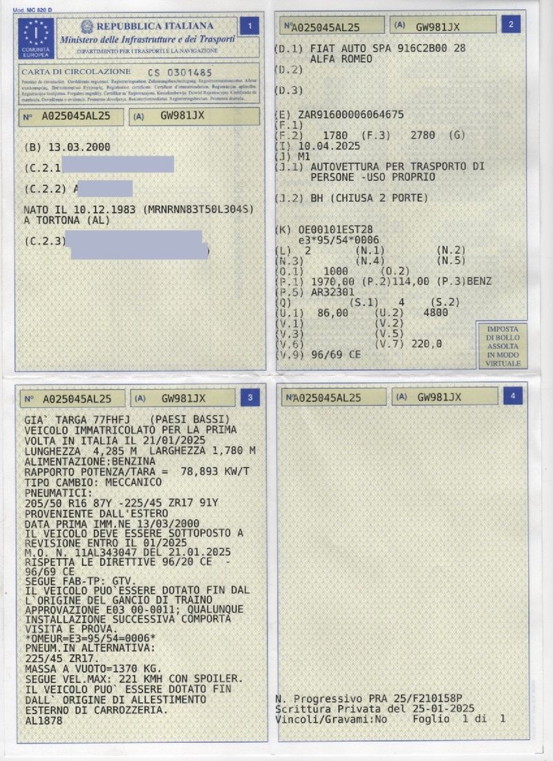 - The vehicle is not reported to be registered with the Automotoclub Storico Italiano