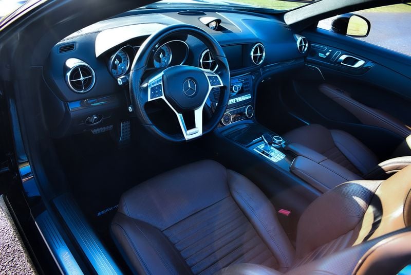Este ejemplar de 2018 está especialmente bien equipado. Acabado en Negro Obsidiano con cuero Brown Exclusive, luce una presencia distinguida y se beneficia del deseable techo de vidrio Vario — una característica que inunda la cabina de luz incluso con el techo cerrado. El Paquete Deportivo AMG incorpora llantas de 19 pulgadas con radios AMG, elementos de diseño AMG y asientos delanteros dinámicos, mientras que las especificaciones mecánicas son amplias: suspensión Active Body Control, control de crucero adaptativo DISTRONIC PLUS, Active Blind Spot Assist, Active Lane Keeping Assist, Active Park Assist, reconocimiento de señales de tráfico y calefacción AIRSCARF a la altura del cuello para conducción al aire libre en climas más frescos. El interior se enriquece con molduras de madera de nogal negro, techo de tela negro Dinamica, iluminación ambiental y un sistema de sonido premium.