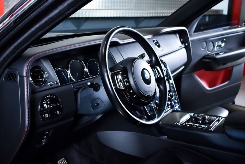 The Cullinan’s clever trick is to be both technologically advanced and clearly hand-crafted. This car sports a very tasteful dark grey metallic over black leather, the whole tied together by neat red detailing such as coachlines, seat stitching and door card trims.
