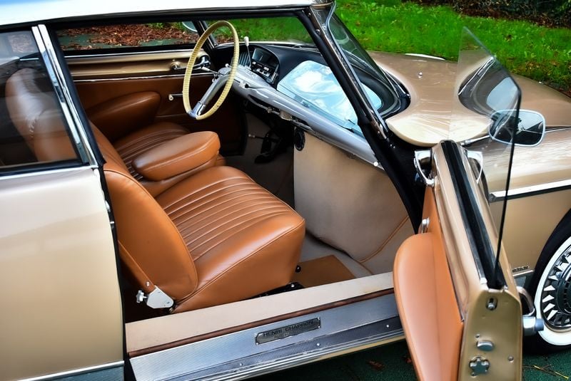 Er is geen doekjes om te winden: deze fraaie auto presenteert zich prachtig, zowel van binnen als van buiten. De lederen bekleding is zorgvuldig gerestaureerd en ademt luxe uit, terwijl het dashboard en de bediening hun unieke mid-century Franse charme behouden. De fraaie, zachte stoelen zijn schoon en keurig gepresenteerd, terwijl de deurstijlaank plates trots de Chapron-naam dragen. De altijd indrukwekkende vierkante klokken en een houten stuur ronden het geheel af.