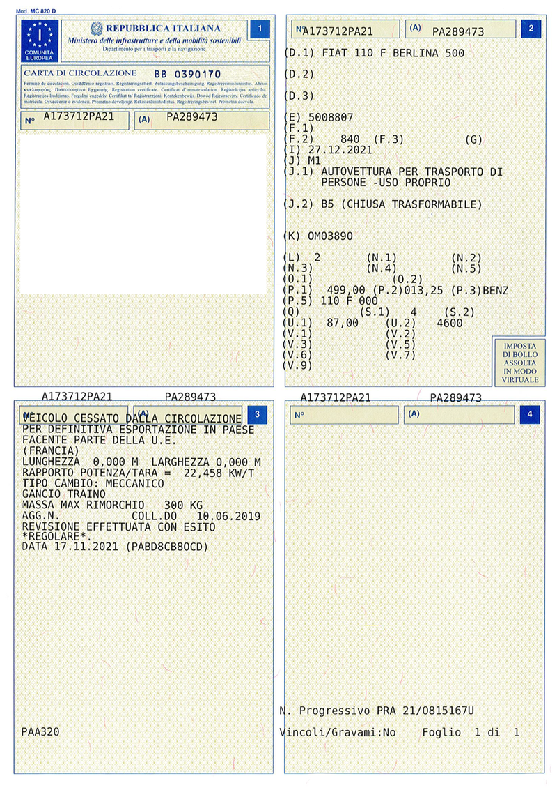 - In Italië in 2020 gerestaureerd door Giovanni Errante, Fiat 500-specialist uit Palermo, Sicilië