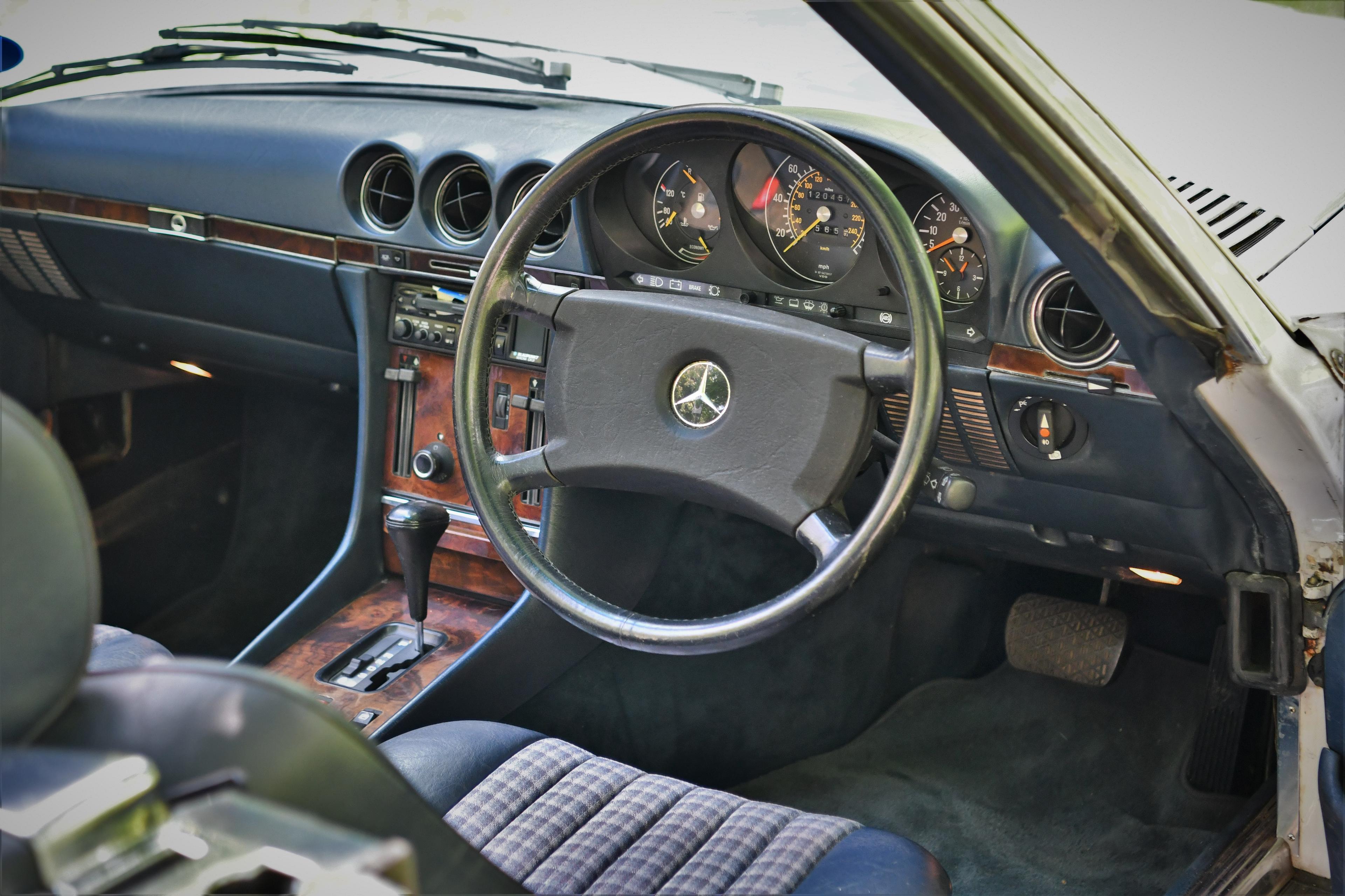 Cloth trim is a very desirable option for an R107 SL – after all, who wants to be sticking to leather in the summer when you’ve got the hood down? And with this check cloth complemented by the stylish blue dash, it makes for a very chic cabin.