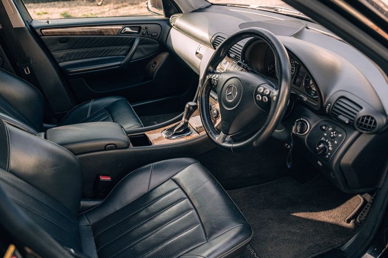 Waar BMW’s neigden naar luidruchtig, was de C55 Mercedes-subtiel, met slechts visuele details die het onderscheid maakten van de meer bescheiden W203’s. In tegenstelling tot sommige aftermarket modding, blijft deze Obsidian Black C55 met lage kilometerstand bij dat thema door alleen zwarte velgen toe te voegen om de dreiging op te voeren. Het is een auto uit de Japanse markt die tot 2022 op de zoutvrije wegen van het land bleef staan, voordat hij naar het VK kwam.