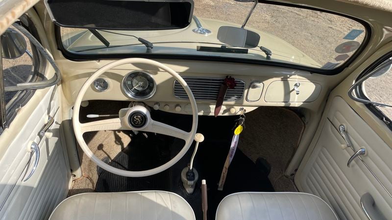 Much like the exterior, the interior cabin of this 1956 VW Beetle is a bright, airy place to be, in no small part thanks to its specification. In fact, the ragtop roof in its open position lets light bounce throughout the light colour upholstery.