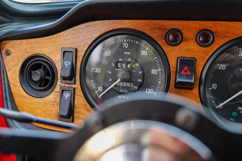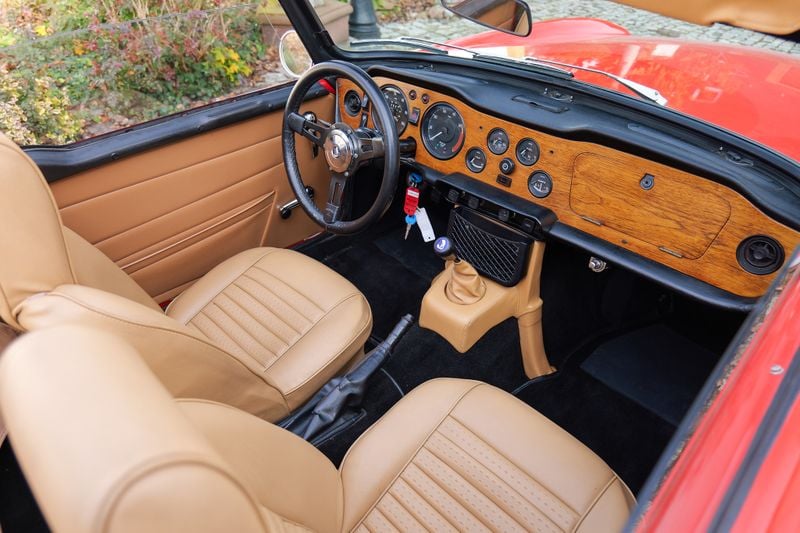 Este encantador TR6 1972 na cor Pimento Red é um exemplo particularmente fino destas clássicas evergreen. Falam-nos que foi restaurado em 2017, trabalho que evidentemente se manteve muito bem, pelas fotos. Para além da pintura, o carro assenta em jantes de aço de empenas profundas de fábrica com embelezadores cromados e vem com uma capota rígida excepcionalmente rara na cor vermelha correspondente. No interior há um habitáculo castanho com bancos actualizados com apoio de cabeça. Completa-se com capota macia castanha e cobertura de bagageiro correspondente.
