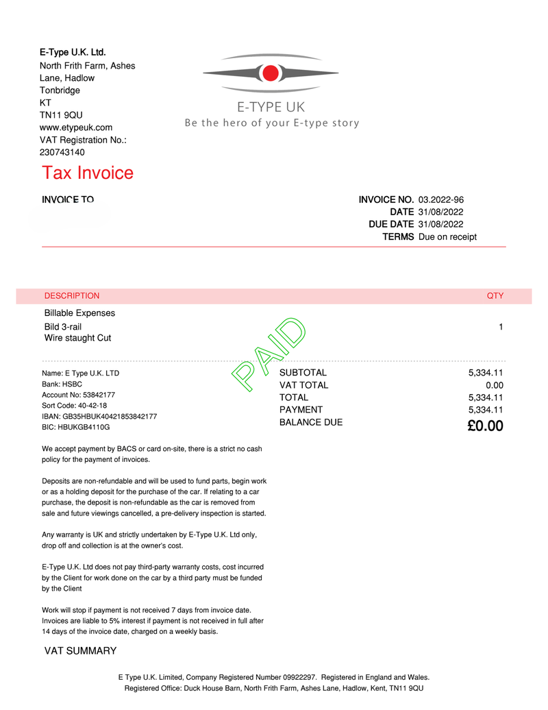- Estas faturas, da E Type UK e da Alan Mann, são mostradas nas fotografias