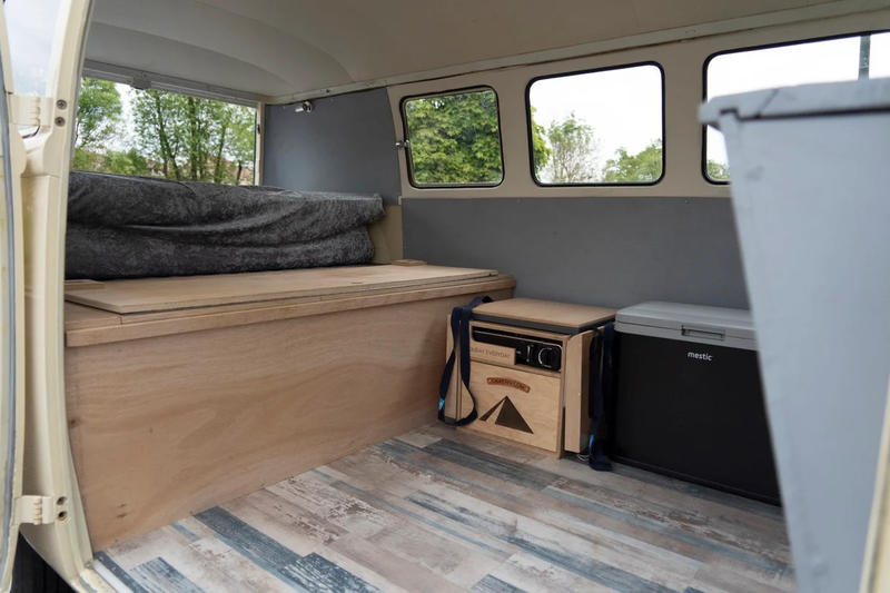 Den bakre kaminen har sedan omvandlats till en specialbyggd utdragbar soffbädd, solcellspanel, fritidsbatteri, kompressorkyl och ett litet mobilt kök.