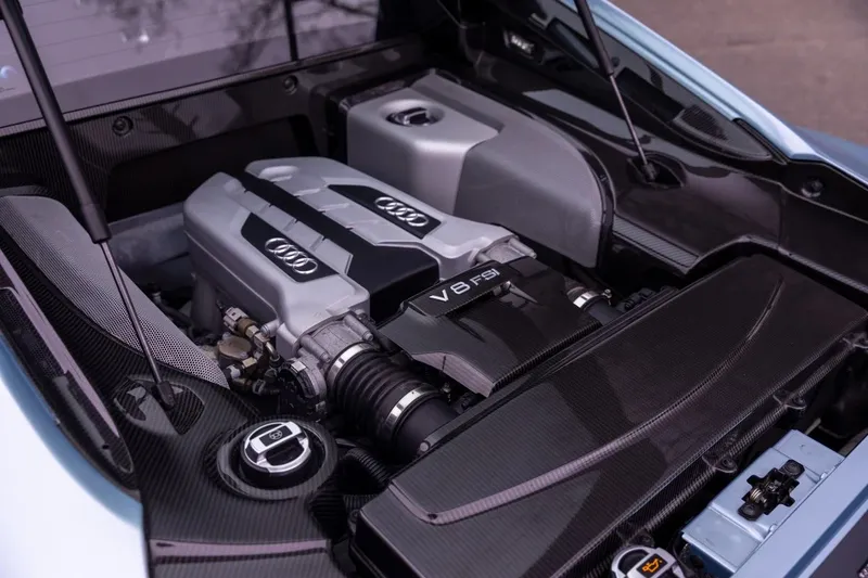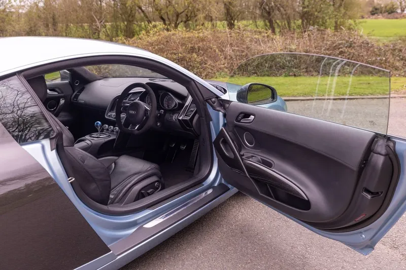 Den är färdigställd i sällsynt ljusblå metallik med ett uppgraderat Nappa-svart läderkabinrum och har bara gått 8 250 mil i två olika ägares händer. Skicket är imponerande, som man kan förvänta sig. Den lämnade fabriken till första ägaren kostande närmare £100,000 tack vare £16,000 i tillval som inkluderar ett uppgraderat ljudsystem, fabrikskarta och Audi Magnetic Ride-fäste. För de som gillar drivlusta kommer sannolikt uppskatta sexväxlad manuell låda istället för den sekventiella automatisk enheten.