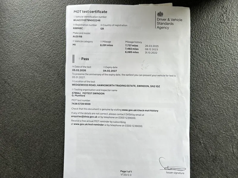 Serviceboken visar omsorgsfull skötsel oavsett körsträcka av huvudåterförsäljare och specialister. I februari 2026 fick bilen ett £2,500-service hos specialisten RE Performance som inkluderade differential, växellåda och bromsvätska. MOT gäller till februari 2027 utan anmärkningar.